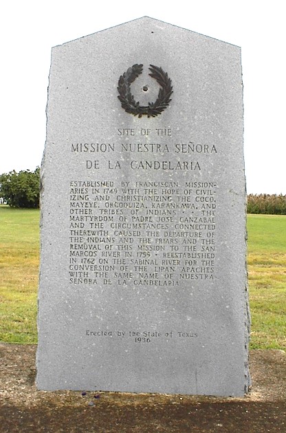 Mission Nuestra Senora de la Candelaria - The Texas Historical Marker is located on County Road 428, at the north crest of the San Gabriel valley between Rockdale and Thorndale in Milam County, at latitude N 30.70352° and longitude W 97.14233°