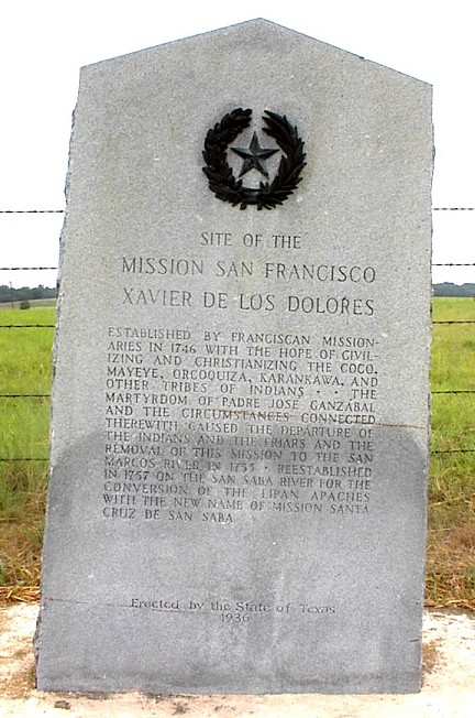 The Mission San Xavier de los Dolores, also known as San Francisco Xavier de Horcasitas Mission, was the first of three San Xavier missions founded along the San Gabriel (known then as San Xavier) River. Located about six miles from the present site of Rockdale in Milam County, the mission was established by the College of Santa Cruz de Querétaro under the recommendation of Father Mariano Francisco de los Dolores y Viana (Father Dolores).
